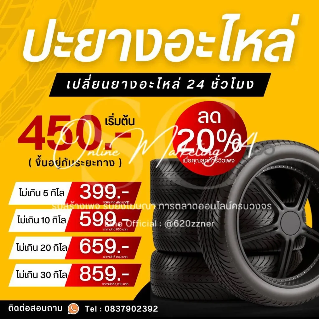 บริการรับปะยางนอกสถานที่ ถึงที่ เร็ว ทันใจ ปลอดภัย เปลี่ยนยางอะไหล่ – เปลี่ยนยางเปอร์เซ็นต์ ซ่อมแซมช่วงล่าง ทุกรุ่น ทุกยี่ห้อ ราคาเริ่มต้นที่ 450.- ( ขึ้นอยู่กับระยะทาง ) กลางคืนก็ไม่ต้องกังวล เราพร้อมช่วยเหลือ 24 ชม. ให้บริการทั่วกรุงเทพฯ และ ปริมณฑล