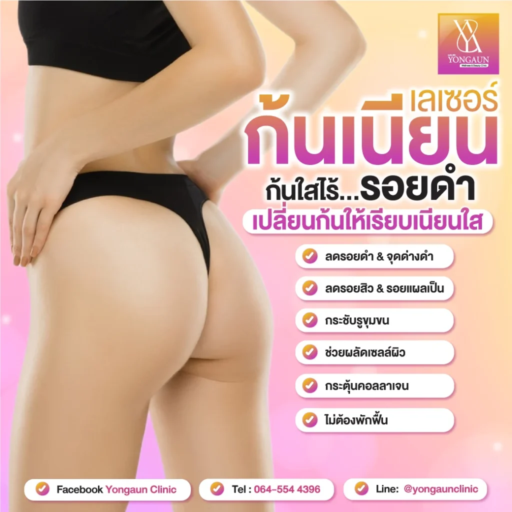 ช่วยแก้ปัญหาก้นดำ ก้นลาย ที่เห็นผลดีและค่อนข้างได้รับความนิยม การทำเลเซอร์สามารถช่วยกระตุ้นการสร้างคอลลาเจนใหม่ ยับยั้งการสร้างเม็ดสี ลดเลือนรอยดำ และปรับสภาพผิวให้เรียบเนียนขึ้นได้