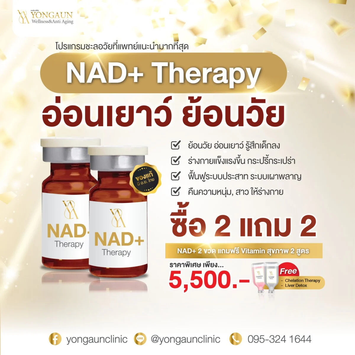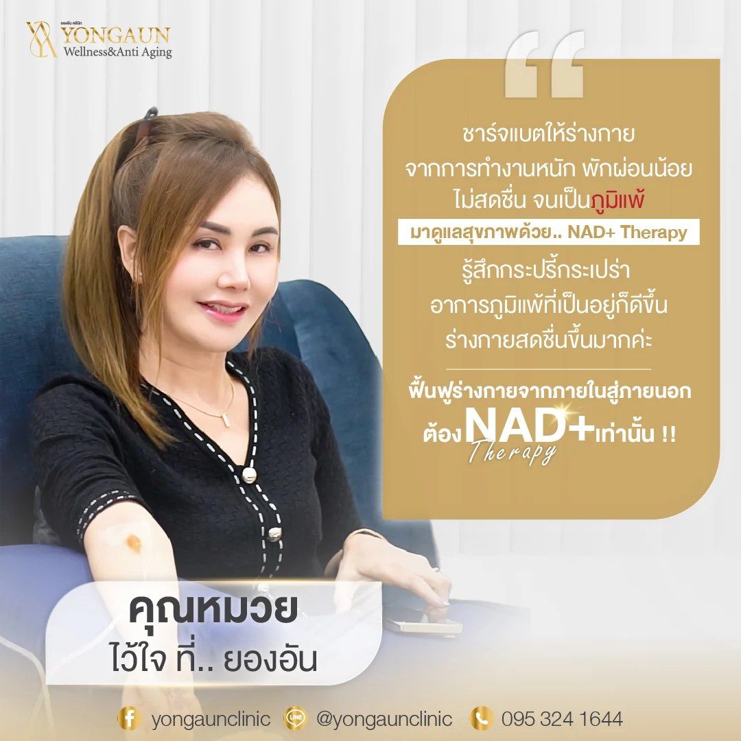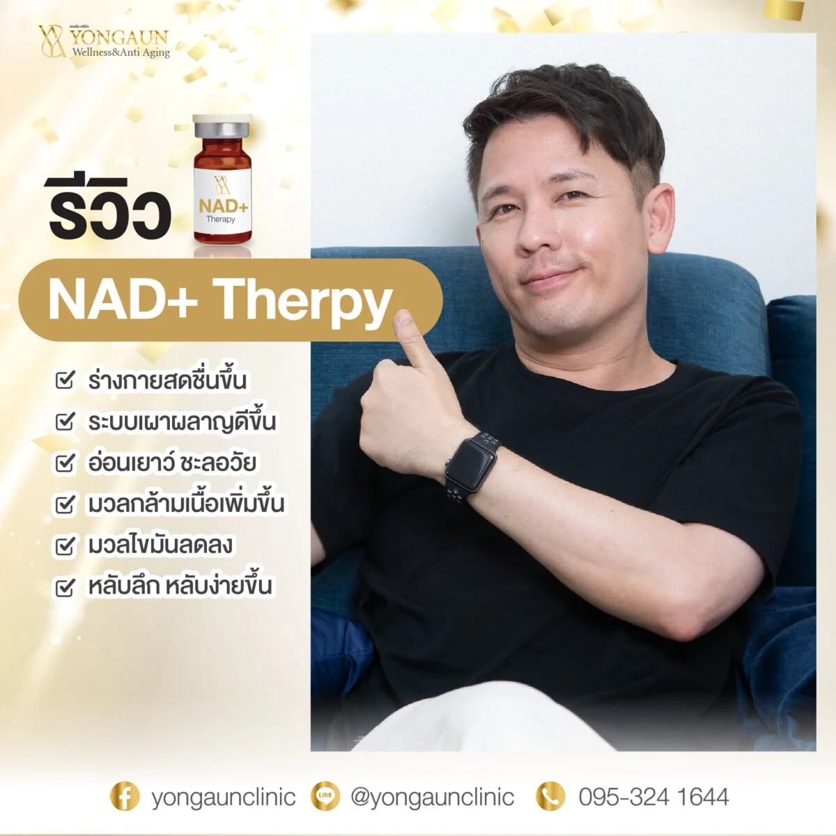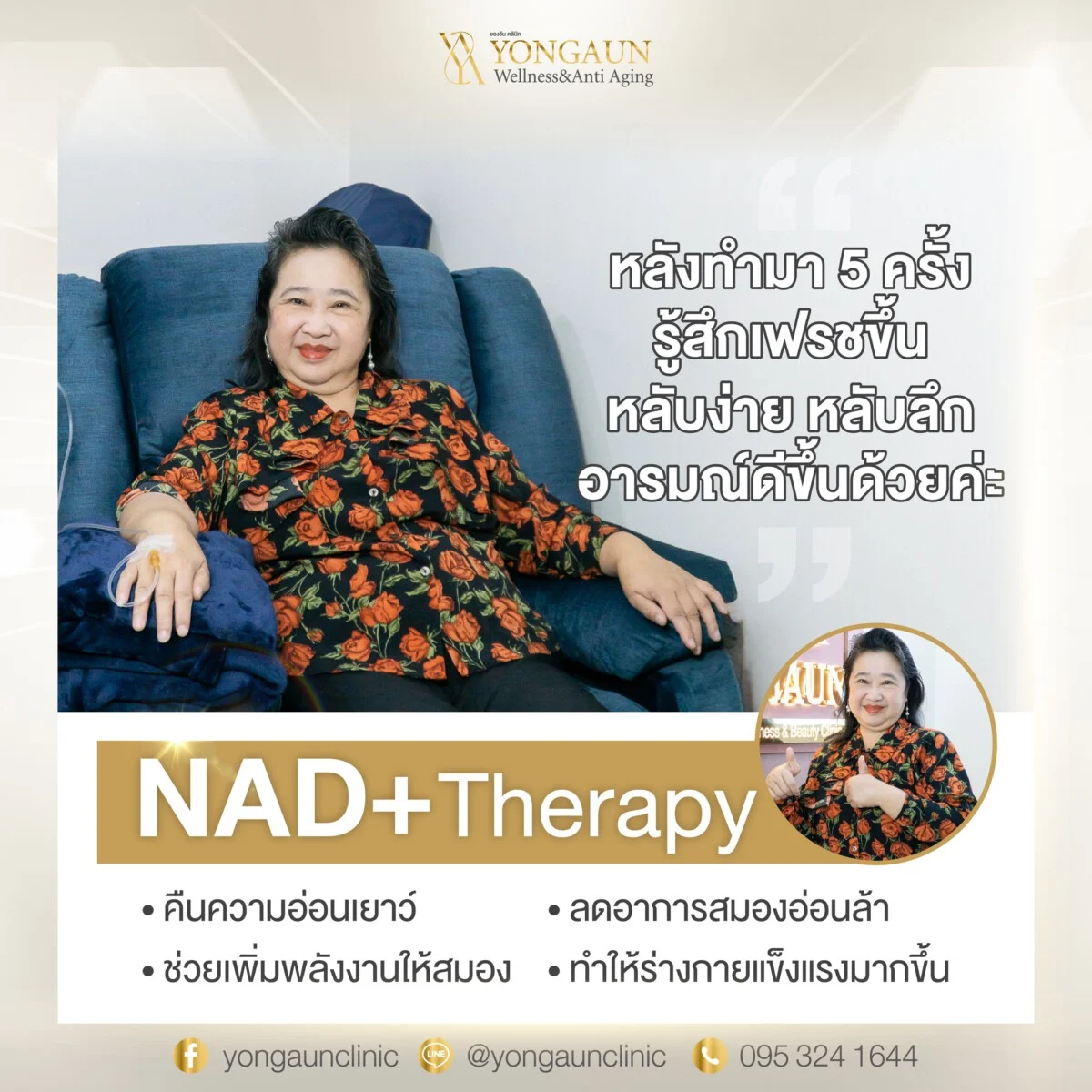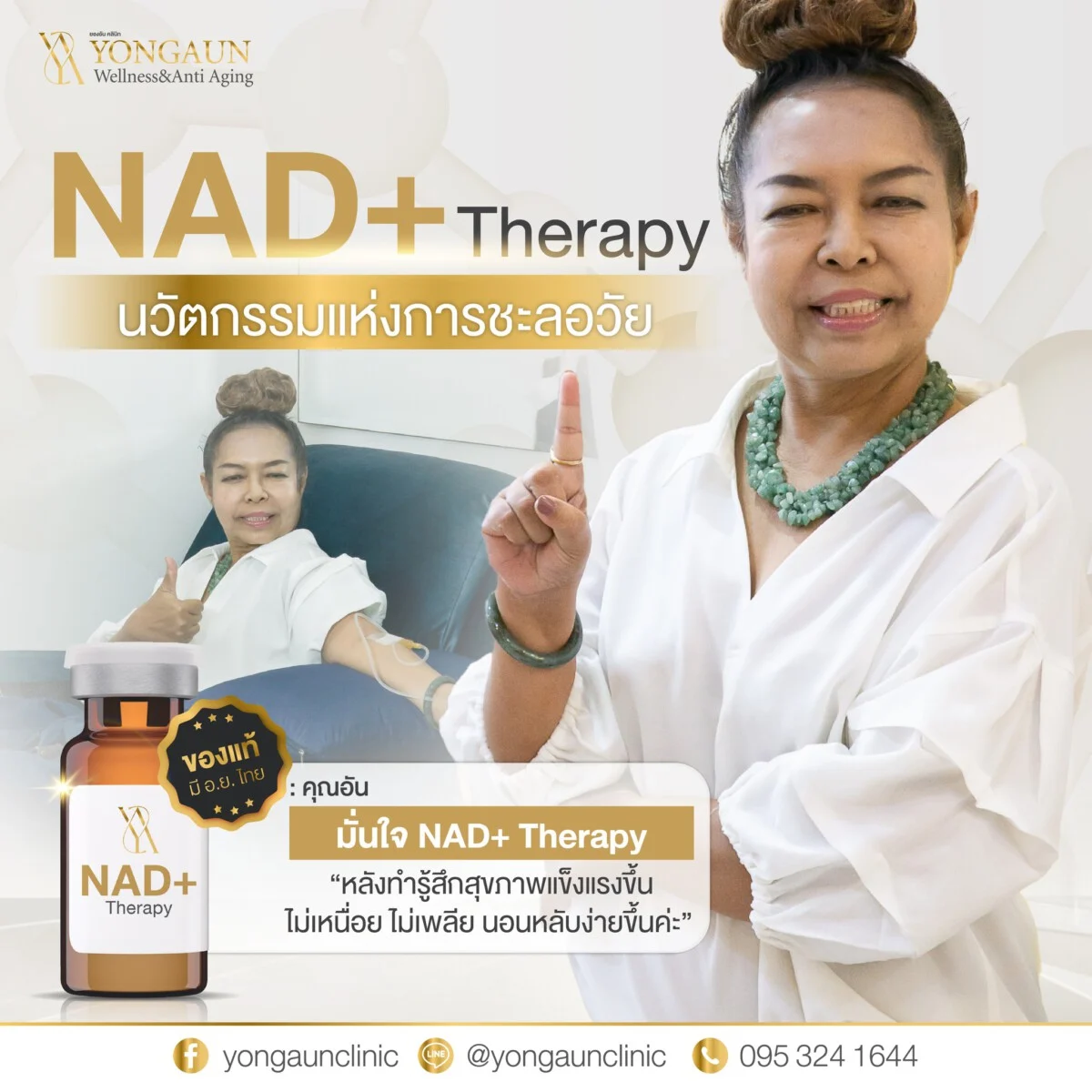 การรักษาที่ใช้การเสริมระดับของ NAD+ ซึ่งเป็นโมเลกุลที่มีความสำคัญต่อการทำงานของเซลล์ในร่างกายโดยเฉพาะในกระบวนการเมตาบอลิซึม (การเผาผลาญ) และการซ่อมแซมดีเอ็นเอ โดย NAD+ มีบทบาทสำคัญช่วยฟื้นฟูพลังงานในร่างกาย ลดอาการเหนื่อยล้า ฟื้นฟูการทำงานของสมอง และอาจช่วยในกระบวนการชะลอความเสื่อมของร่างกาย