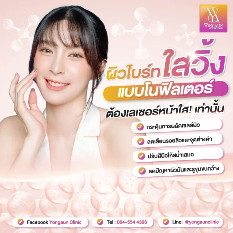 เลเซอร์หน้าใส ทางลัดผิวอ่อนวัย ผิวหน้ากระจ่างใส ไร้รอย เทคโนโลยีดูแลผิวพรรณที่ได้รับความนิยมอย่างมากในปัจจุบัน เนื่องจากช่วยทำให้เซลล์ผิวเก่าผลัดได้เร็วขึ้น ให้ผลลัพธ์ชัดเจนในเวลาอันรวดเร็ว สามารถช่วยลดรอยดำ รอยแดงที่เกิดจากสิว ลดฝ้า กระบนใบหน้า ทำให้ผิวหน้าที่โทรม หมองคล้ำดูกระจ่างสดใส และยังช่วยกระตุ้นการสร้างเซลล์ผิวใหม่เผยผิวใสขึ้น